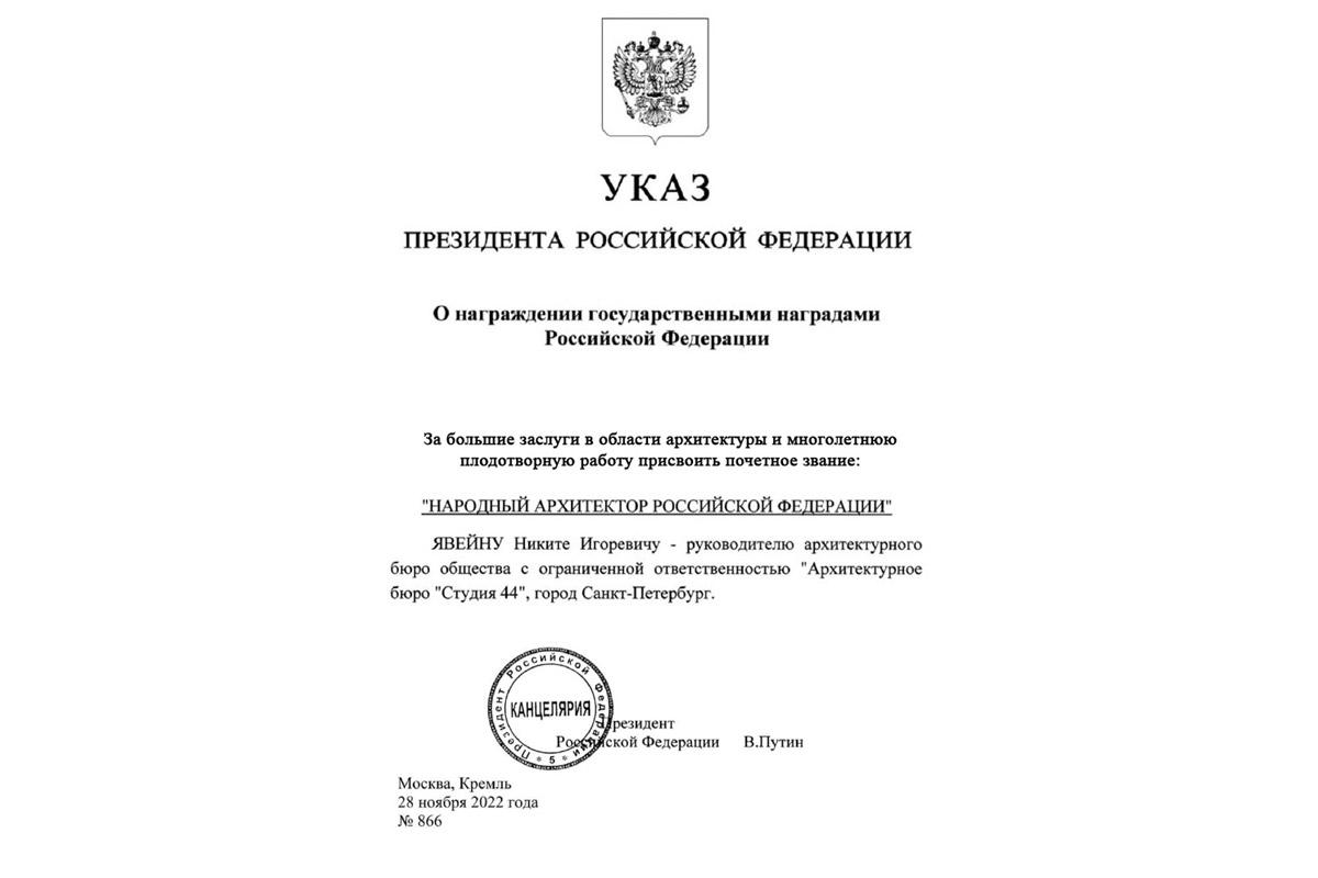 Указом президента РФ N866 от 28 ноября 2022 года руководитель «Архитектурного бюро «Студия 44» Никита Игоревич Явейн получил почётное звание «НАРОДНЫЙ АРХИТЕКТОР РОССИЙСКОЙ ФЕДЕРАЦИИ» за большие заслуги в области архитектуры и многолетнюю плодотворную работу.