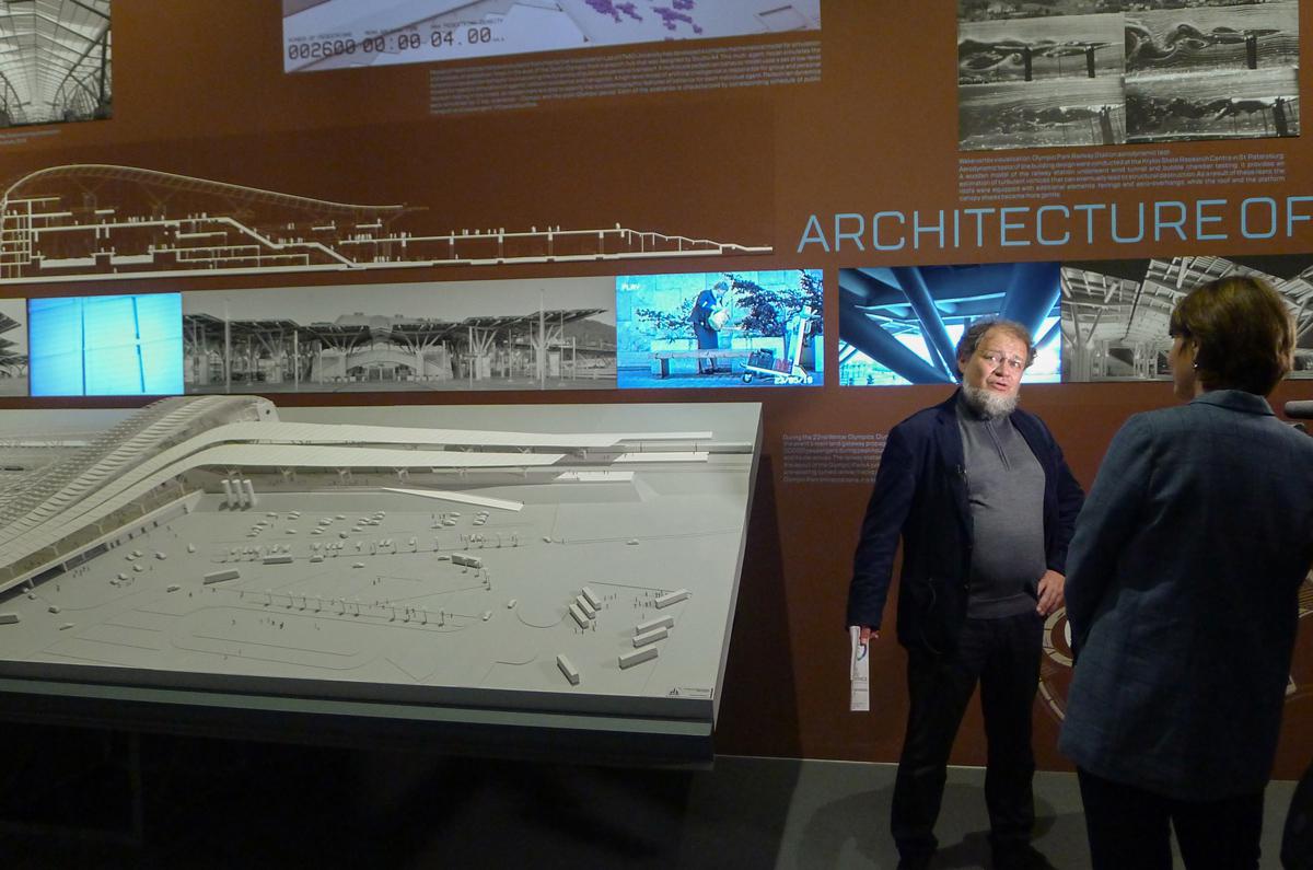 Мы подготовили большой макет вокзала «Олимпийский парк» и на его примере наглядно показали, как людские потоки формируют архитектуру здания. При участии ЛИТМО была разработана математическая модель вокзала. В павильоне на экранах мы визуализировали программы, отображающие плотность людского потока на вокзале, его движение, своеобразные завихрения, возникающие в определенных местах: у входов и выходов, точек общепита и т. д. Показали, как плотность людского потока изменялась во времени: максимальный поток возникал, когда поезда прибывали каждые 15 минут. В местах, где поток плотнее, были устроены более широкие проходы, в местах поворотов и завихрений появились обтекаемые формы. На выставке мы продемонстрировали также, как воздействуют на здание ветровые нагрузки (материалы испытаний в аэродинамической трубе). На стене павильона мы поместили птицу, идеально спроектированное природой существо, чью форму тела определяют воздушные потоки. И на планшете рядом с птицей показано, как форма крыши здания повторяет форму ее крыла. Помимо этой основной экспозиции мы подготовили для российского павильона справки о вокзалах в Курске и Великом Новгороде, построенных по проектам моего отца, Игоря Георгиевича Явейна.